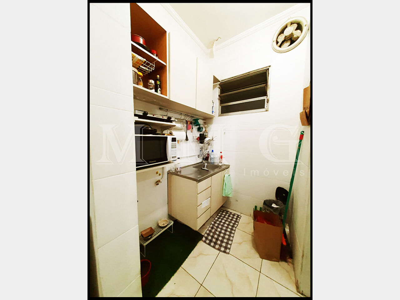 - Cozinha com armários e gabinete.