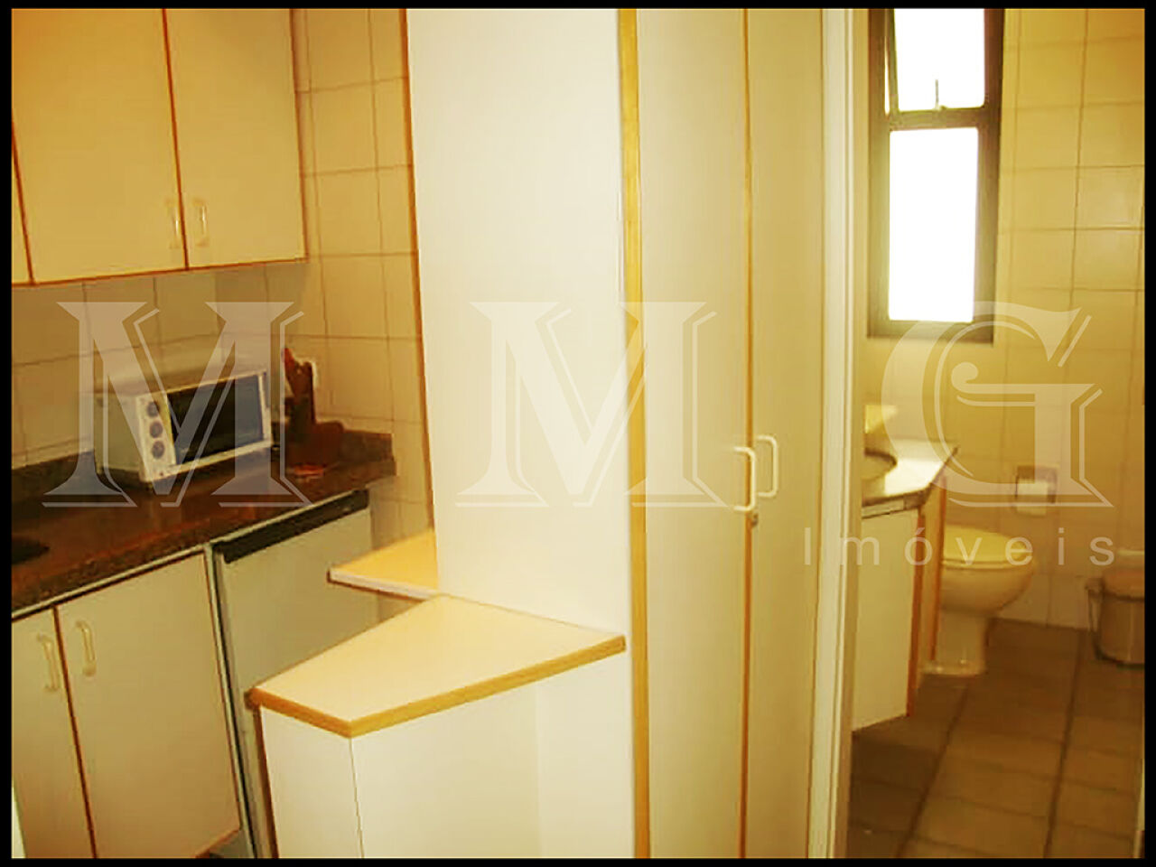 Copa-cozinha e área de serviço conjugadas com armários.